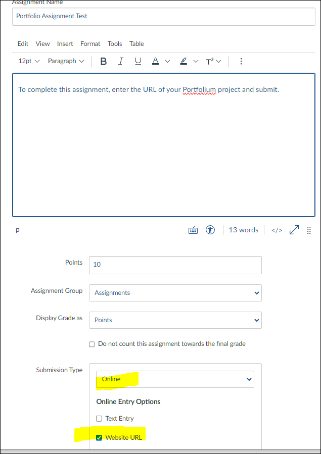 The best way to create a graded Portfolium assignment is to have students share the link to their uploaded project with you. When a URL is submitted as an assignment, Canvas takes a screenshot of the web page at the time it was submitted. Below are the steps to creating an online assignment in Canvas and a screenshot to use as a guide for getting started.