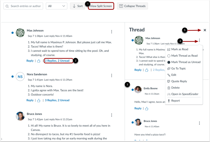 - To view threaded replies in a split screen sidebar, click the View Split Screen button.
