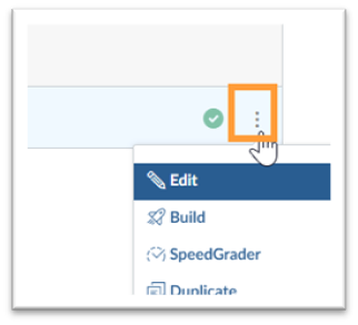 - From a graded area (Assignments, Quizzes, Discussions), select Speedgrader from the MORE button with 3 vertical dots next to the item name.