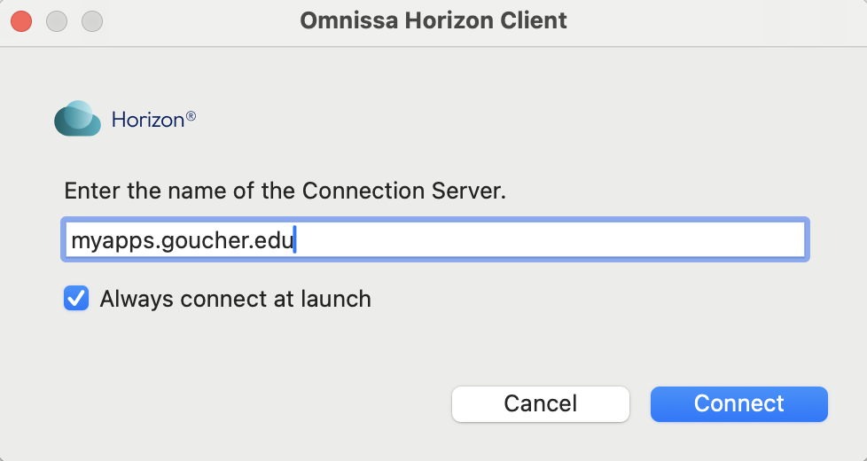 You only have to configure the Horizon Client Server on your computer once. The next time you launch this software, just double-click the MyApps.goucher.edu icon and enter your Goucher username and password to continue.