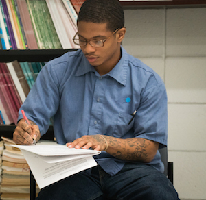 Over the next year, Moreno kept writing and writing to the box. During that time, he became a GED tutor helping Spanish speakers. Finally, his persistence paid off. He’s now in his sixth semester at Goucher, taking two classes at a time. This fall, he’s taking American Religion and Social Reform with Brad Stoddard and Theater with Brian Francoise. Classes take place in the education building at MCIJ, where you can almost forget you’re in a prison. The classrooms have no bars on the windows, just a blackboard, desks and chairs, posters on the wall, and rows of eager students.